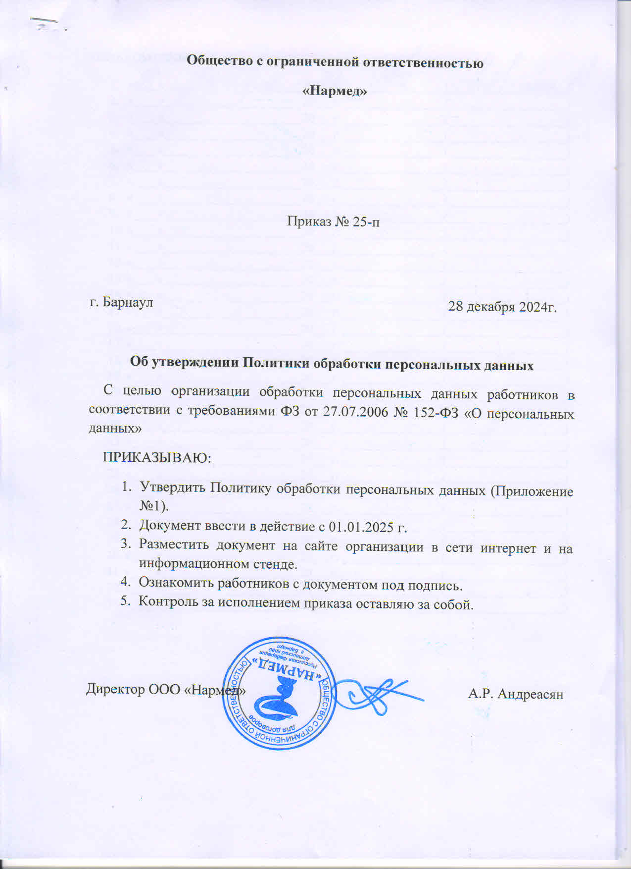ПОЛИТИКА ЗАЩИТЫ И ОБРАБОТКИ ПЕРСОНАЛЬНЫХ ДАННЫХ ООО "Нармед"