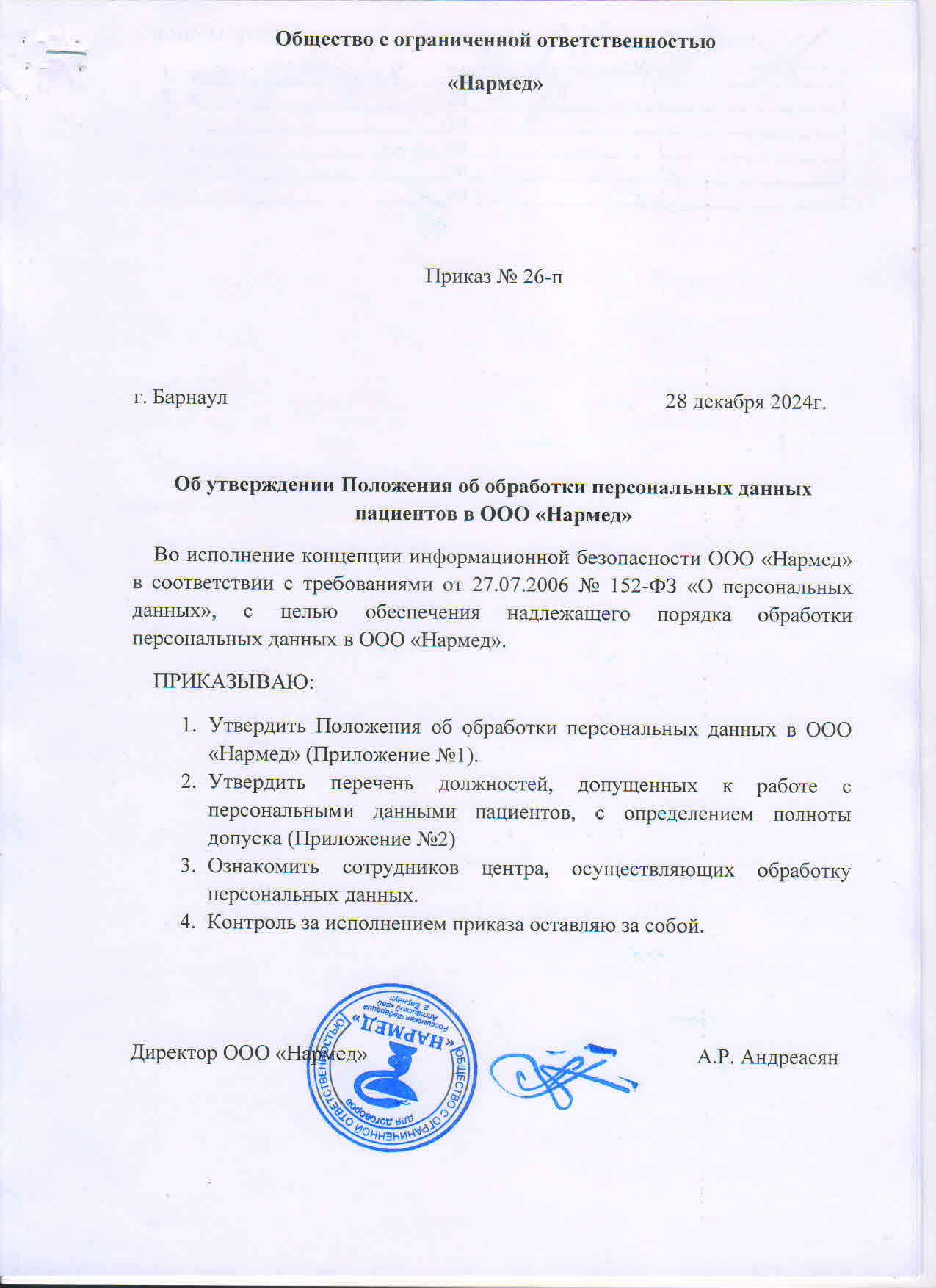 Приказ N 26-п. Об утверждении Положения об обработке персональных данных пациентов в ООО "Нармед"