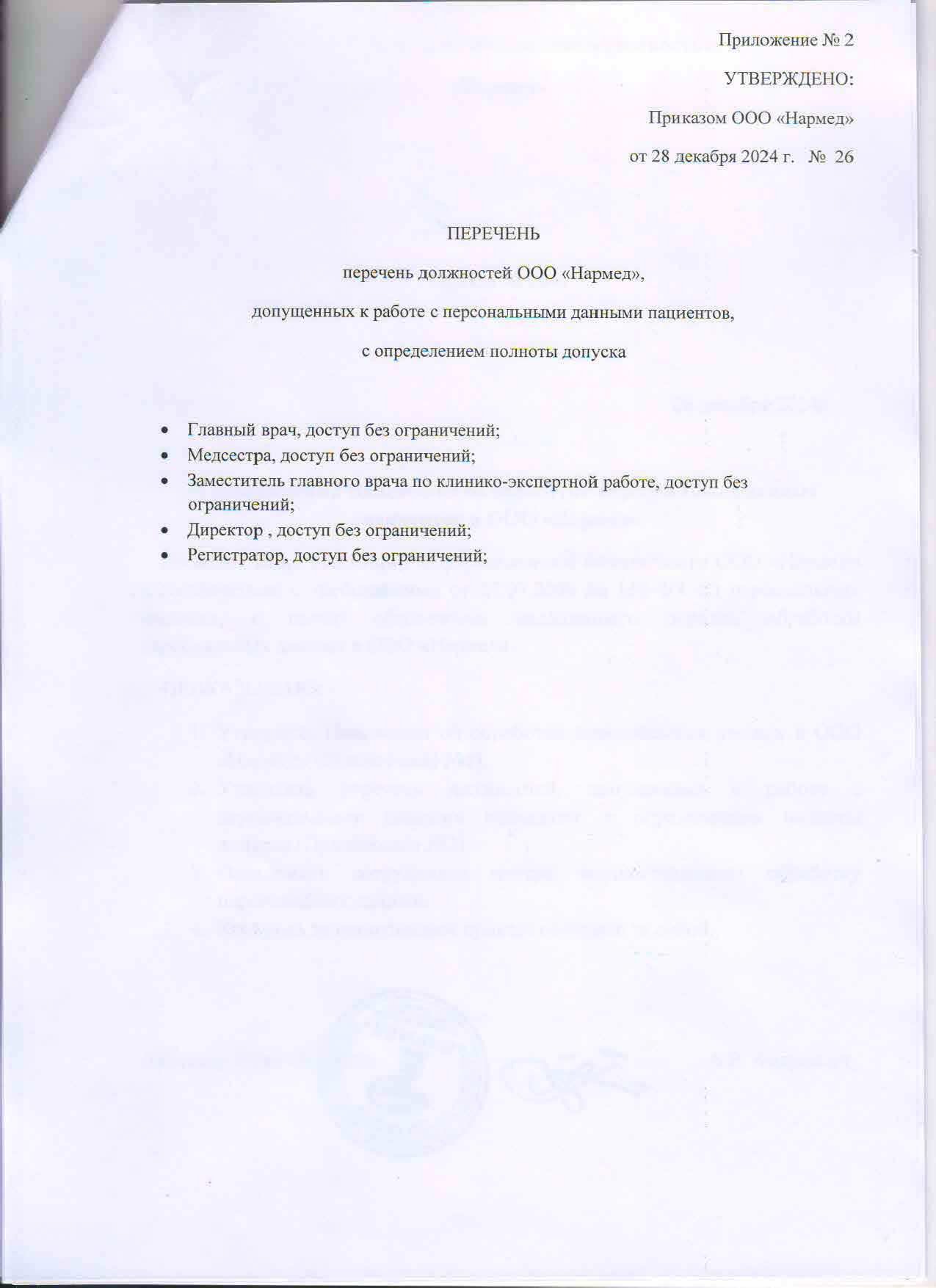 Перечень должностей ООО "Нармед", допущенных к работе с персональными данными пациентов, с определением полноты доступа